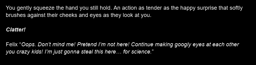 Congrats on all the work! I hope you’re all happy and healthy; whenever you release it, it will be amazing. When it does release, instead of me escaping Entity, Entity will have to escape me. I NEED THEIR HAND IN MARRIAGE. 😔 Please be the Morticia to my Gomez Entity.